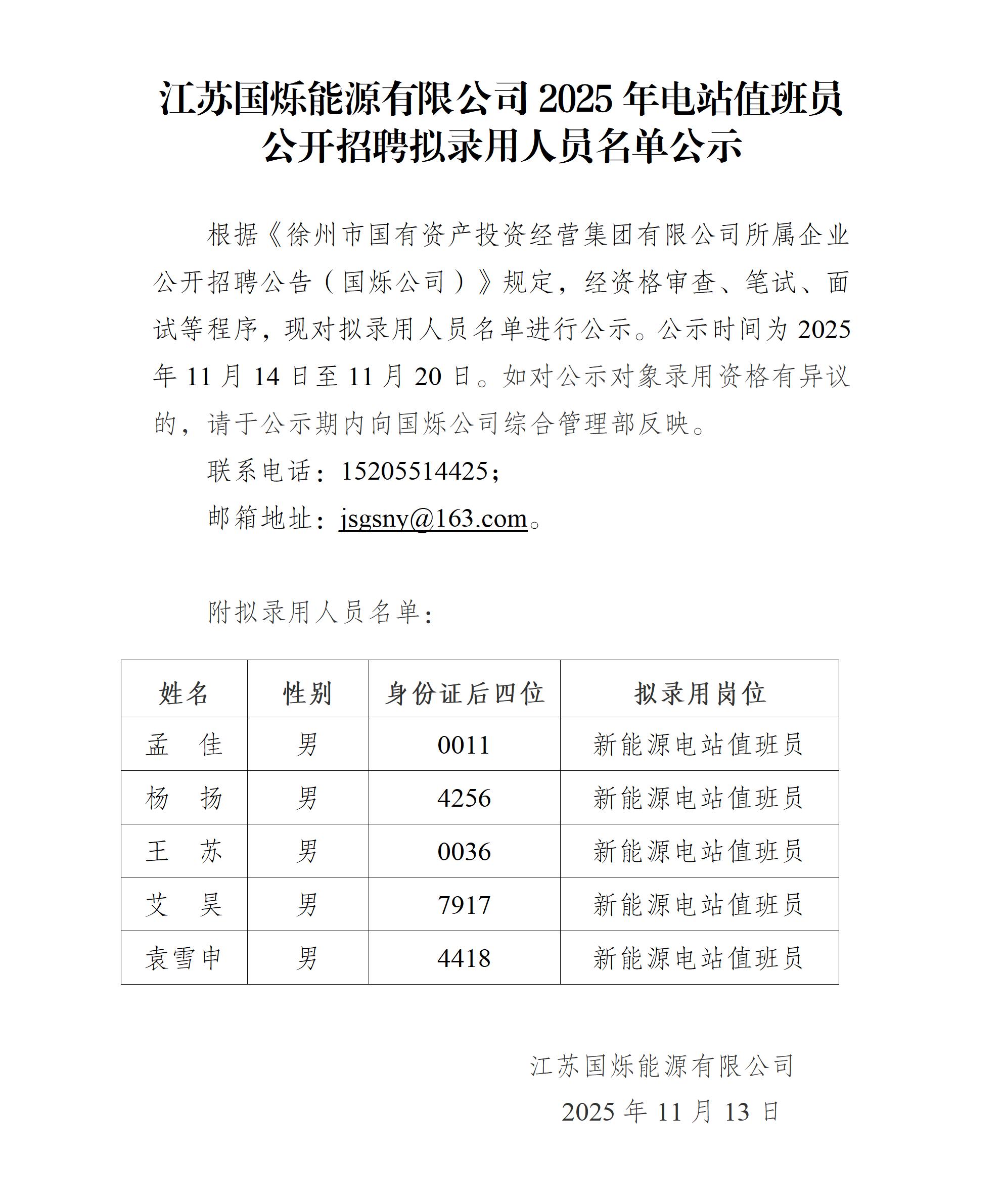 江蘇國爍能源有限公司2025年電站值班員公開招聘擬錄用人員名單公示