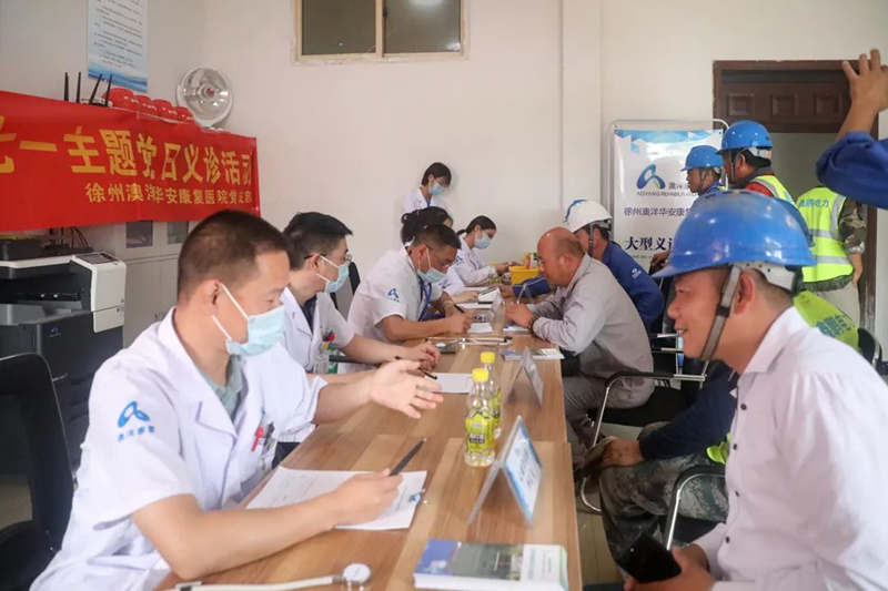 徐州澳洋華安康復醫(yī)院的醫(yī)務人員深入項目建設現(xiàn)場,為奮戰(zhàn)在建設一線的施工及管理人員開展義診活動?;顒又?,醫(yī)療專家和醫(yī)護團隊細心嚴謹為每一位一線工人進行血壓血糖檢測、用藥指導、身心健康問題解答等。本次義診活動現(xiàn)場氣氛和諧融洽,讓項目全體員工深切感受到了黨組織的溫暖和關懷。