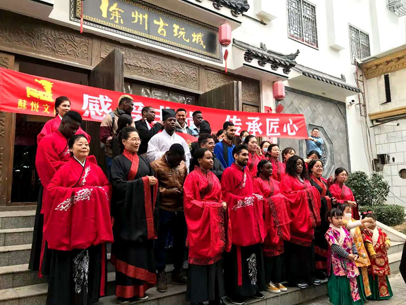11月15日上午,來自烏茲別克、津巴布韋、巴基斯坦、哈薩克斯坦、馬里、尼泊爾等國家的江蘇師范大學(xué)留學(xué)生們來到了國投集團(tuán)蘇悅文化廣場,參加由華強(qiáng)黨總支蘇悅黨支部牽頭舉辦的“感受非遺,傳承匠心”文化推廣活動(dòng)。國家對留學(xué)生的引進(jìn)制定了完備的教育體系,其中一項(xiàng)就是對中國傳統(tǒng)文化的弘揚(yáng),讓留學(xué)生走向社會(huì),增強(qiáng)進(jìn)一步學(xué)習(xí)和領(lǐng)會(huì)中國文化的魅力。留學(xué)生們在蘇悅文化公司工作人員的帶領(lǐng)下,穿著各色傳統(tǒng)漢服全面的參觀了徐州古玩城市場。中國漢服非遺研究員李洪蓮、李博老師系統(tǒng)地講解了中國傳統(tǒng)服飾——漢服的歷史和演變,并親自指導(dǎo)留學(xué)生們著漢服走秀、行禮,吸引了眾多路人的駐足。