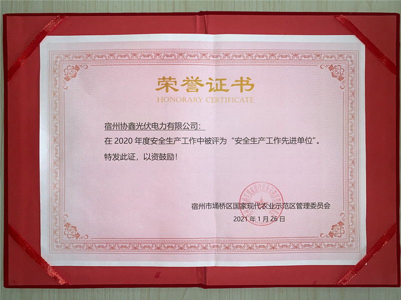 2021年2月1日,在國家現(xiàn)代農(nóng)業(yè)示范區(qū)管委會(huì)召開的年度安全工作會(huì)議上,管委會(huì)對(duì)國投環(huán)能公司所屬宿州協(xié)鑫光伏電站2020年度安全生產(chǎn)工作總體情況進(jìn)行通報(bào),對(duì)人員持證上崗、安全目標(biāo)責(zé)任書的落實(shí)以及電站各項(xiàng)安全宣貫培訓(xùn)等工作做出高度評(píng)價(jià),授予國投環(huán)能公司所屬宿州協(xié)鑫光伏電站2020年度“安全生產(chǎn)工作先進(jìn)單位”榮譽(yù)稱號(hào)。