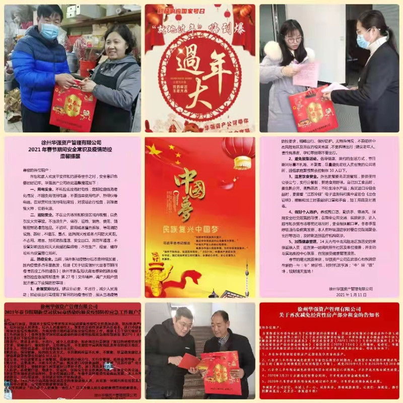 乘著辭舊迎新的東風(fēng),在新春佳節(jié)來臨之際,為積極響應(yīng)國家衛(wèi)健委和徐州市政府“就地過年”行動號召,華強資產(chǎn)公司策劃了以“2021——華強與你,年在一起”為主題的新春送“?!迸哪晡犊蛻舸鹬x活動,為就地過年的租戶營造溫暖的節(jié)日氛圍。2月1日起,資產(chǎn)部租賃專員將滿載著祝福與關(guān)懷的福袋送到各自管轄的租戶手中,向多年來支持公司發(fā)展的租戶表示感謝,進一步提升了租戶對公司的認同感和歸屬感。