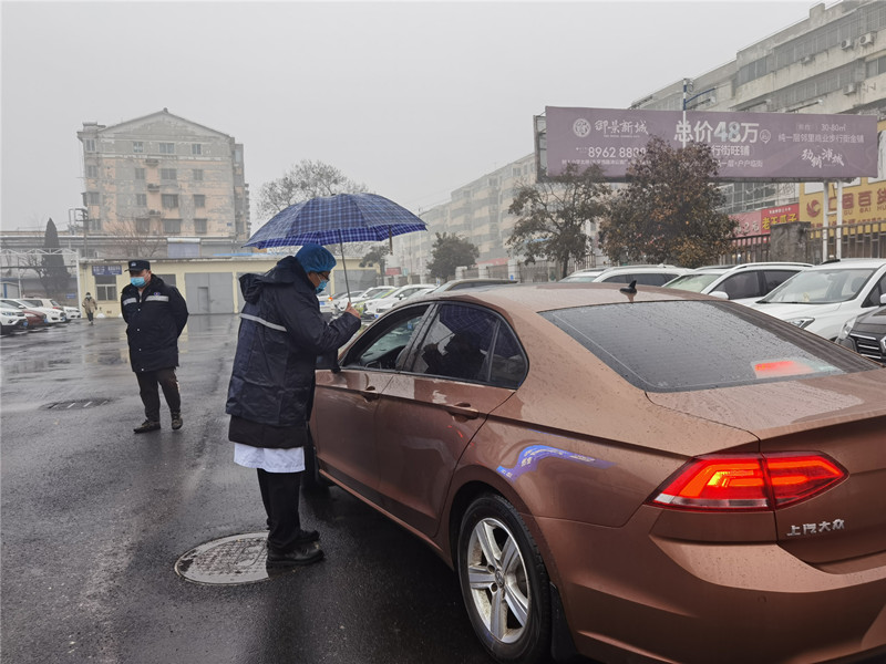 幾位臨床科主任率先垂范,積極參加到預檢分診工作中。內二科朱增武主任,干部內科王光宇、范德龍主任,中醫(yī)科張守春主任......他們雖然年紀不輕,平時科室管理、業(yè)務十分繁忙,但為支持疫情防控工作,率先站到了防控一線的崗位上,并用一貫認真的工作態(tài)度,仔細為每一個進入醫(yī)院的患者做好預檢分診。雨中,朱增武主任一手擎著傘,一手拿著測溫儀,在車輛入口為司機進行測溫,只見他身體前傾,把傘靠向開窗接受測溫的司機,寧可自己淋在雨中。58歲的王光宇主任,患有冠心病、高血壓、腰椎鍵盤突出等疾病,但他毫不猶豫地站到了抗疫一線,每天一站就是幾個小時。