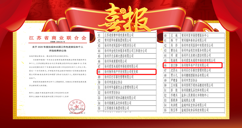 近日,華強(qiáng)黨總支物華黨支部因在2020年度抗擊新冠肺炎疫情工作中表現(xiàn)突出,被江蘇省商業(yè)聯(lián)合會評為“江蘇省商業(yè)聯(lián)合會2020年度抗疫和社團(tuán)工作先進(jìn)單位”,物華黨支部書記查文靜同志榮獲“抗疫和社團(tuán)工作先進(jìn)個人”。