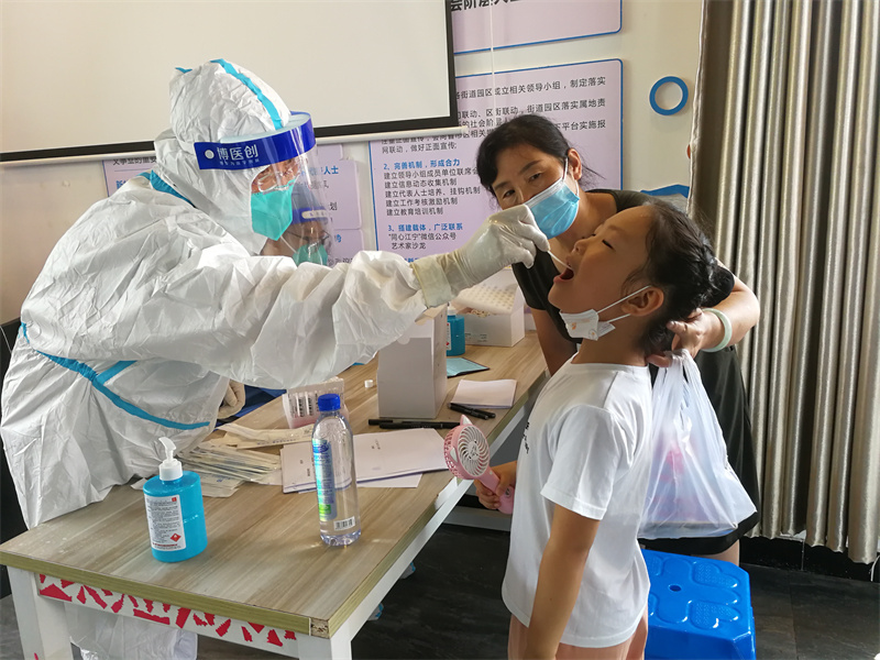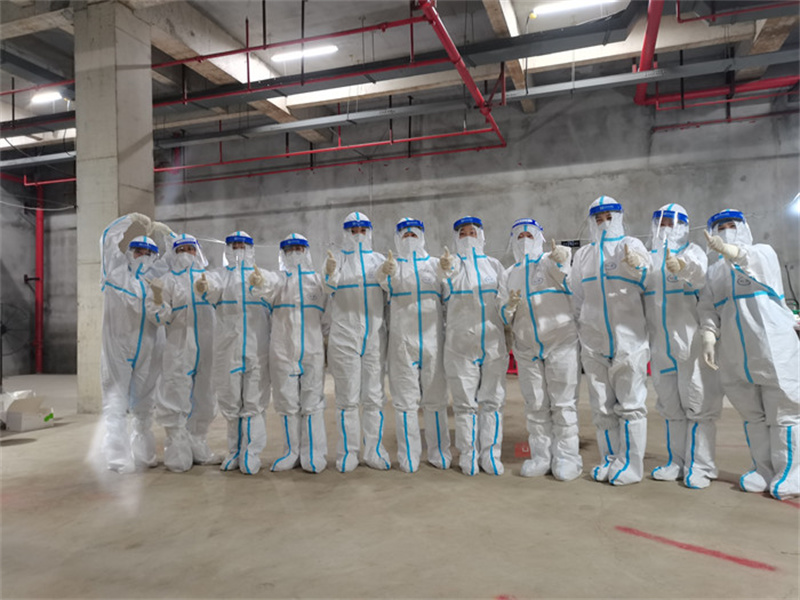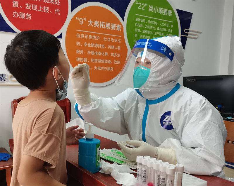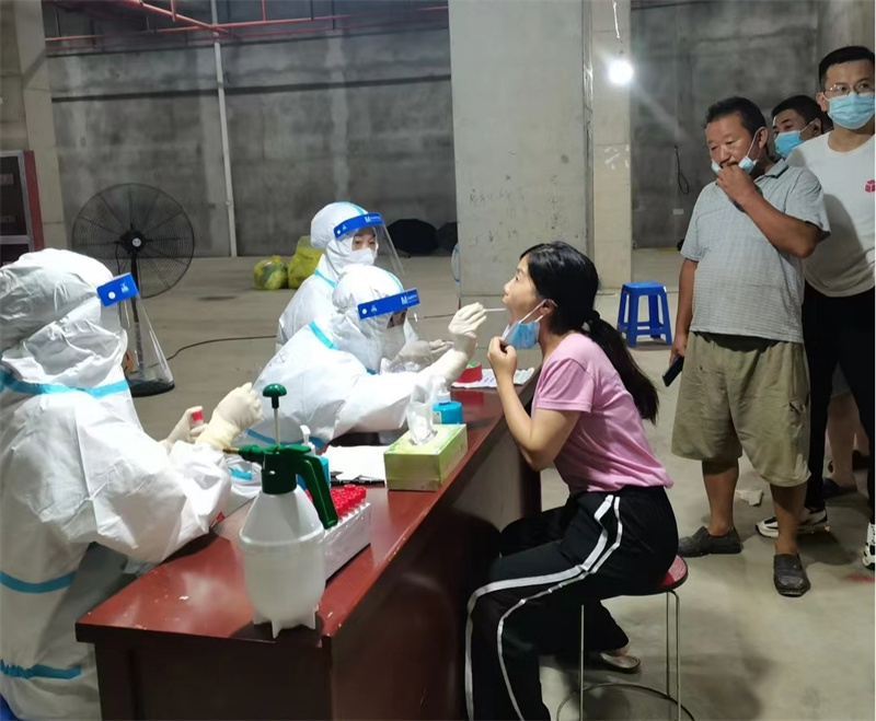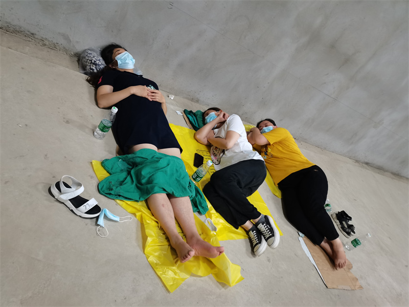 條件的簡(jiǎn)陋,為采樣工作增加了難度。在炎熱的環(huán)境下,她們穿著密不透風(fēng)的防護(hù)服,帶著N95口罩、面屏和多層手套,不停地為持續(xù)不斷到來(lái)的居民進(jìn)行采樣。大到90多歲的老人,小到幾個(gè)月的嬰兒,一直戰(zhàn)斗到晚上11點(diǎn)多,在8個(gè)小時(shí)的時(shí)間里,憑著她們麻利地操作和熟練的技術(shù),共為4000人完成了核酸采樣。采樣結(jié)束后,有的姐妹累得撐不住了,脫了防護(hù)服,顧不得雨天地面的潮濕,直接躺在了生硬的水泥地上。