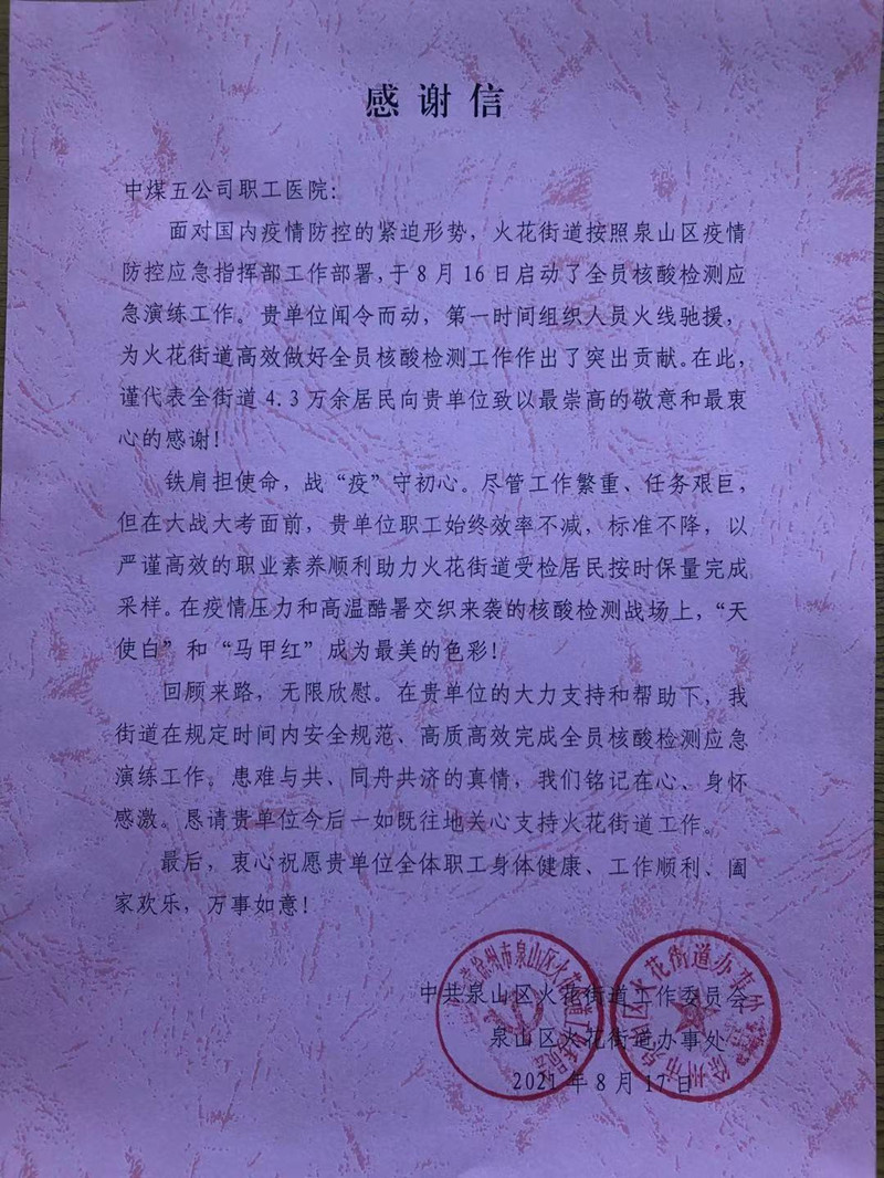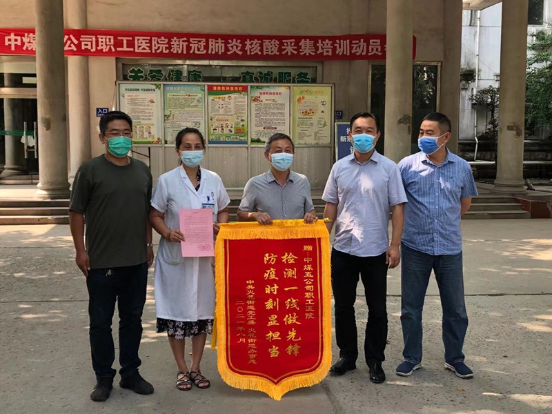 8月19日上午,泉山區(qū)火花辦事處領(lǐng)導(dǎo)一行來到中煤五公司職工醫(yī)院,并送上感謝信和錦旗,表示“在中煤五公司職工醫(yī)院的大力支持和幫助下,街道在規(guī)定時間內(nèi)安全規(guī)范、高質(zhì)高效完成全員核酸檢測應(yīng)急演練工作?;茧y與共、同舟共濟得 真情我們銘記在心、身懷感激”。院黨委書記宋俊祥代表全院參戰(zhàn)職工接受感謝信和錦旗,并表示今后將一如既往支持街道辦事處工作,共同戰(zhàn)役、共擔(dān)使命。