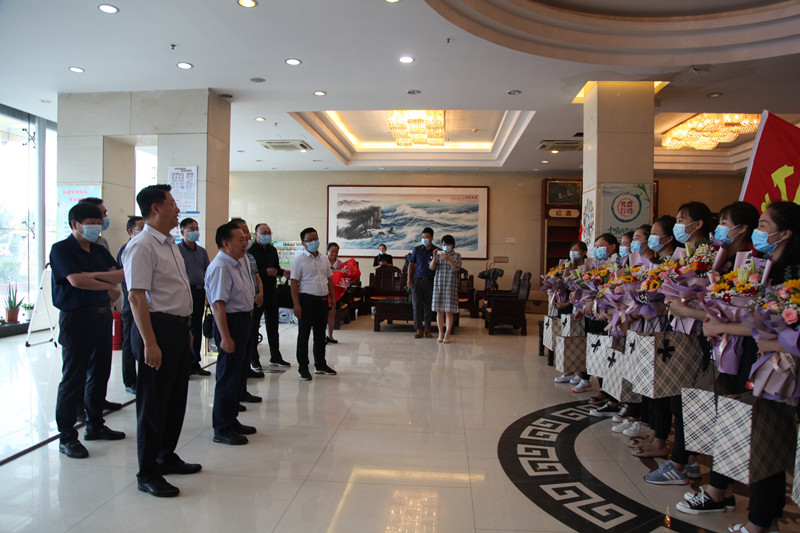 27日早上8點,12名抗疫隊員們穿著貼有國旗標識的統(tǒng)一服裝,高舉著鮮紅的黨旗,懷著激動的心情列隊等候在大廳,李曉東董事長、姜巖總經(jīng)理與她們一一親切握手、問候,親手送上鮮花與禮盒,并與她們合影留念。