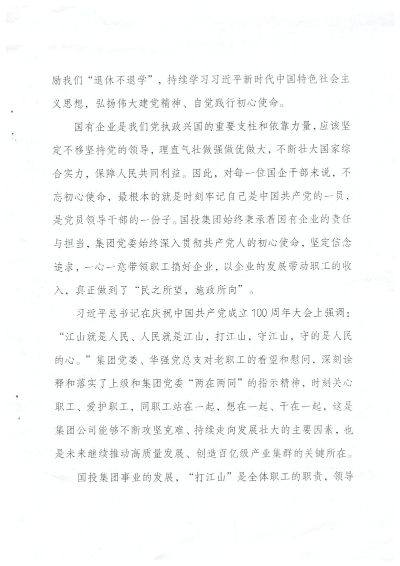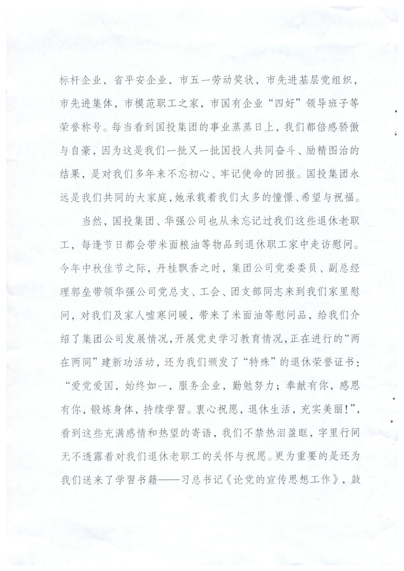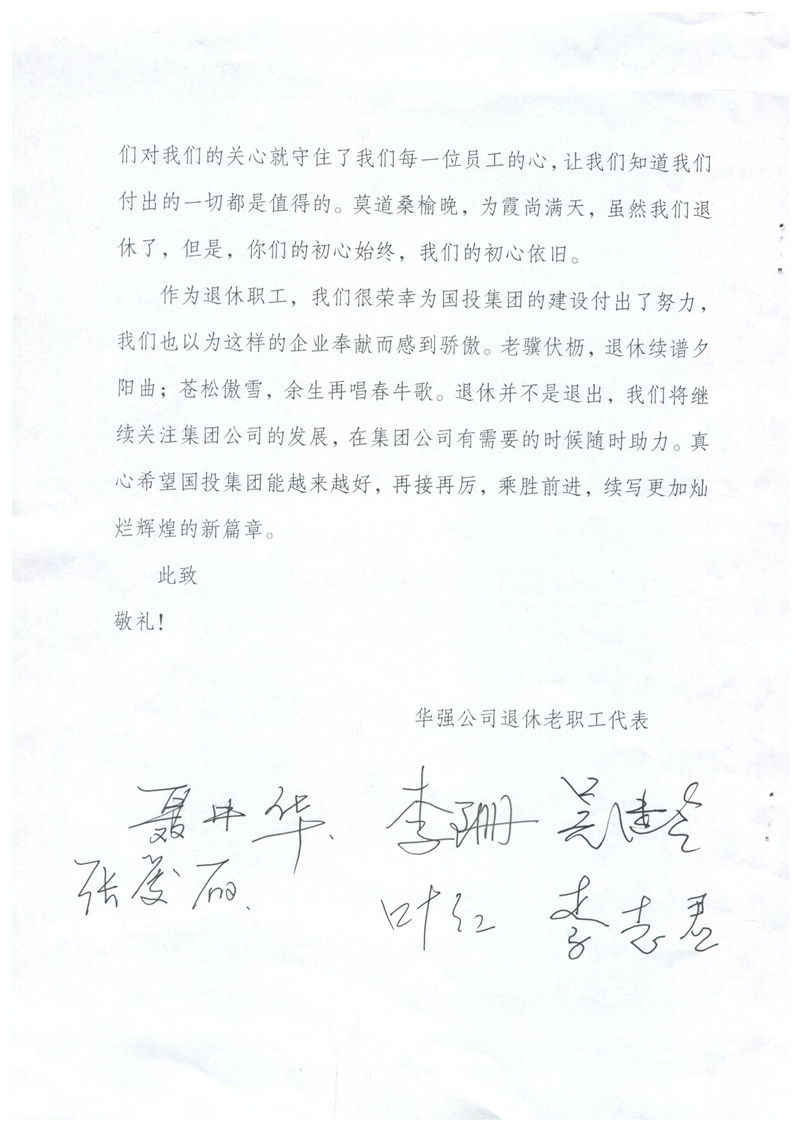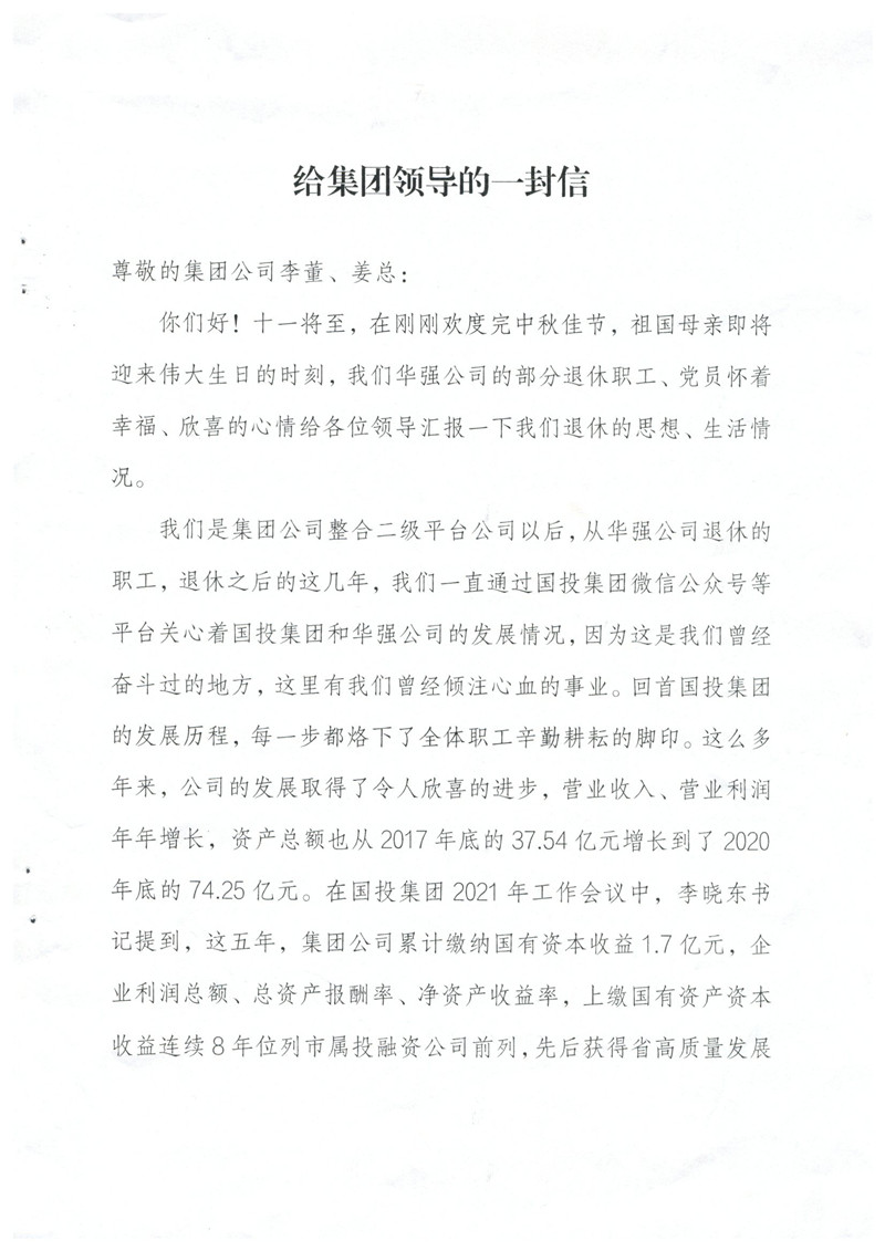 您們好!來信收悉。在中秋佳節(jié)之后,國慶即將來臨之時(shí),收到老同志們的來信,倍感親切,老同志們退休不退出,一直關(guān)心支持國投集團(tuán)改革發(fā)展情況并積極建言獻(xiàn)策的精神讓我們感動,正是由于像您們一樣的徐州國投老同志們的無私奉獻(xiàn)和精神感召,全集團(tuán)2000余名在崗職工勤勉履職,愛崗敬業(yè),開創(chuàng)了徐州國投來之不易的發(fā)展成績,我們表示非常感謝,并向您們和國投集團(tuán)全體退休老同志致以誠摯的問候!