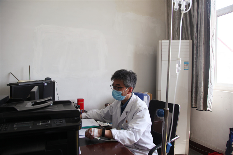 除了辛苦奮斗在采樣現(xiàn)場(chǎng)的人員,還有一位帶給大家感動(dòng)的人,他就是防控辦副主任趙智勇。防控任務(wù)責(zé)任重大,事無(wú)巨細(xì)。自負(fù)責(zé)防控工作以來(lái),他加班加點(diǎn),付出了大量心血,晚上參加上級(jí)防控會(huì)議是家常便飯,會(huì)議開(kāi)到凌晨一兩點(diǎn)鐘并不少見(jiàn)。身邊的同事評(píng)價(jià)他“趙老師是全年無(wú)休!”工作的緊張及辛苦,使他得了高血壓,這次全員核酸檢測(cè)時(shí),他還在輸液治療中。為了不影響工作,他只能中午在辦公室一邊輸液,一邊聯(lián)絡(luò)協(xié)調(diào)采樣現(xiàn)場(chǎng)工作,并每小時(shí)一次對(duì)各采樣點(diǎn)報(bào)來(lái)的核酸采樣數(shù)據(jù)進(jìn)行匯總上報(bào)。