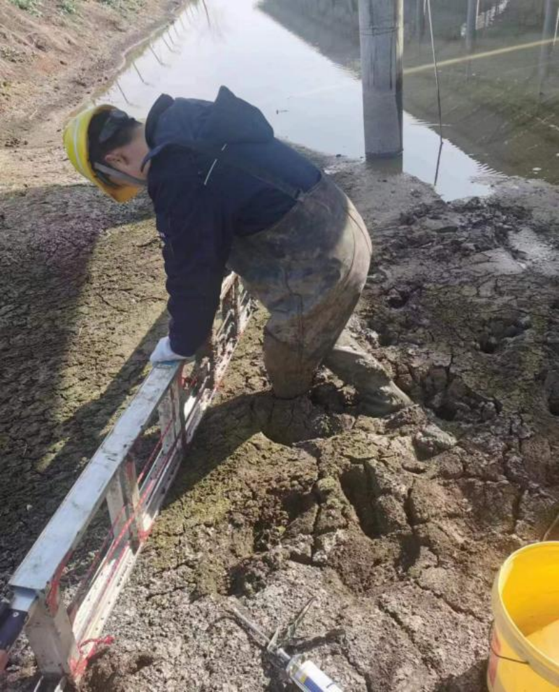 冬日的阜南縣格外寒冷,車輪壓過地面殘留的積雪發(fā)出咯吱咯吱的聲響,路兩旁的枯枝在風中搖晃。阜南電站是“農(nóng)光互補”光伏項目,裝機容量100MW,由王化鎮(zhèn)、于集鄉(xiāng)、地城鎮(zhèn)三個地塊組成,劉忠保在這幾條熟悉的路線上不知道往返了多少趟。下車后,冷風吹得劉忠保打了個寒顫,裹緊了身上的工作服,匆匆換上了水褲,背著裝備走向了光伏區(qū)。由于特殊的地理環(huán)境,阜南電站部分光伏區(qū)遍布著淤泥,踩在半人之高的淤泥中每走一步就會留下一個深深的泥坑。等到故障處理結(jié)束,劉忠保和同事已經(jīng)在零下的水溫里泡了兩個小時,上岸后,他不停揉搓已經(jīng)凍得麻木的手。