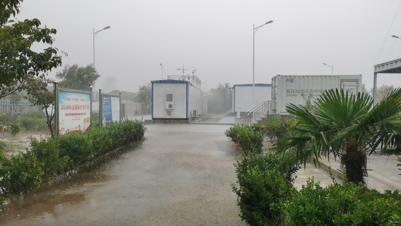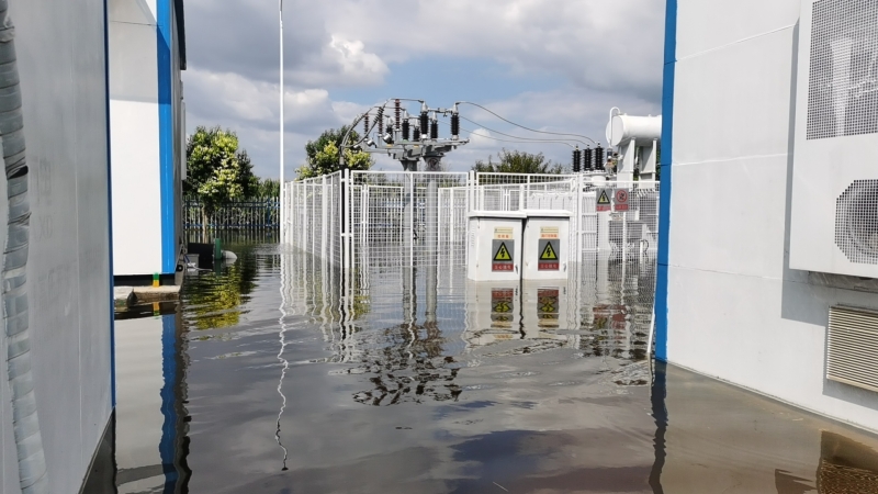 狂風(fēng)暴雨自9月17日12點(diǎn)來襲,由于碭山鑫能電站所處地勢低洼,很快形成積水。電站人員首先切斷了電動(dòng)門、生活水泵、電纜溝風(fēng)機(jī)等設(shè)備電源,防止因進(jìn)水短路可能引發(fā)的安全事故;將400V低壓ATS電源由常用模式切換至備用模式,并將35KV站用接地變514開關(guān)由運(yùn)行轉(zhuǎn)冷備用,防止因水位上升對(duì)設(shè)備的影響。