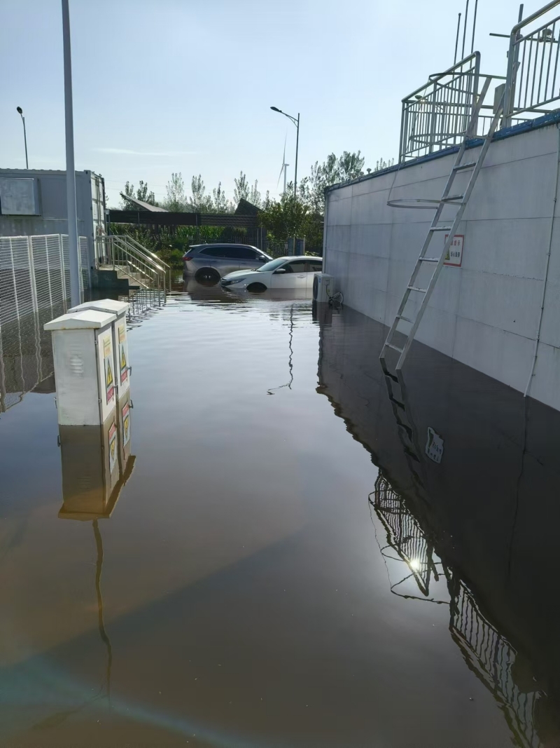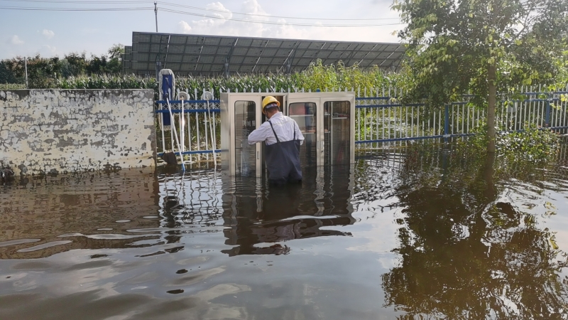 雨勢越來越猛,積水也越積越多,同時(shí)電站外面的積水也在向內(nèi)倒灌,遠(yuǎn)遠(yuǎn)望去,站內(nèi)的積水和周邊村莊田地連成一片汪洋。劉忠??粗e水高度的逐步上漲,先是淹到了腳踝,后來是空調(diào)外機(jī),眼瞅著已經(jīng)到了控制室和設(shè)備艙的臺(tái)階處,“于紀(jì)瑤,你跟我一起去查看積水情況!”兩人合力將地板掀開,看到下面已經(jīng)是積水。“10公分,再升高10公分,設(shè)備就會(huì)產(chǎn)生巨大損壞,也會(huì)造成短路風(fēng)險(xiǎn)”劉忠保心里盤算著,“可是現(xiàn)在拉閘,發(fā)電量也會(huì)造成損失?!彼才烹娬救藛T白天全員在崗、夜間輪換值班,通過24小時(shí)不間斷值守對(duì)站內(nèi)重要設(shè)施進(jìn)行高頻率水位監(jiān)視,密切關(guān)注電纜溝水位與高壓開關(guān)柜底部距離、接地變附近水位以及一次、二次室內(nèi)部濕度情況,力爭撐到最后的安全線再拉閘,將損失降到最低。