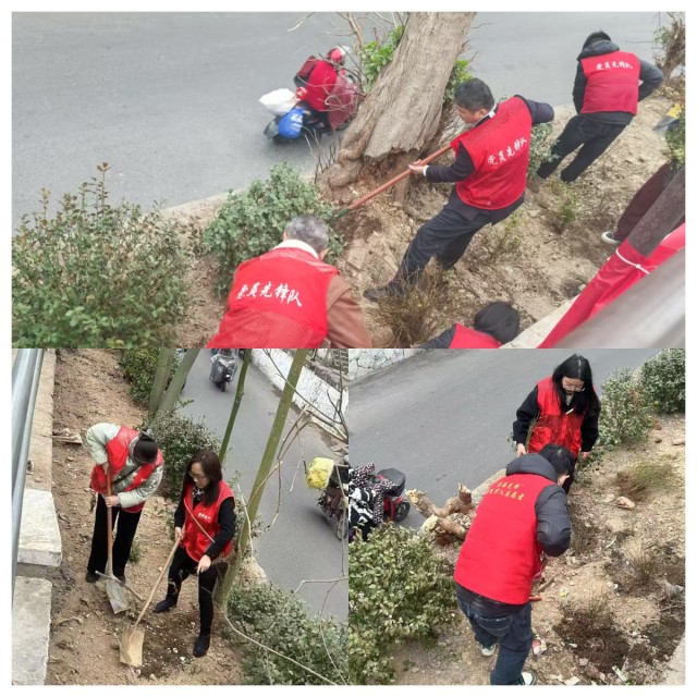 活動(dòng)現(xiàn)場,黨員們充分發(fā)揮模范帶頭作用,他們身穿“黨員先鋒隊(duì)”紅馬甲、佩戴黨員徽章,精神飽滿、熱情高漲地投身在綠化活動(dòng)中,大家二人成組、三人成團(tuán),有的扶苗栽種,有的揮鍬填土,有的抬水澆灌,各個(gè)環(huán)節(jié)一絲不茍、井然有序。在黨員先鋒隊(duì)成員們的辛勤勞動(dòng)和默契配合下,南天竹、迎春花等綠植苗紛紛被種下,為社區(qū)綠化帶增添了新景觀。