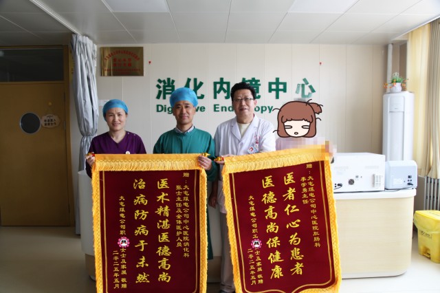 5月28日上午,46歲的張女士踏入大屯煤電公司中心醫(yī)院的胃鏡室,親手將兩面熠熠生輝的錦旗分別遞給了李學勇和張士兩位醫(yī)生。她緊緊握住醫(yī)生們的手,滿懷感激地連聲說道:“謝謝!謝謝你們兩位,還有你們的團隊!我真是太幸運了,能遇到你們,在做胃腸鏡檢查時及時發(fā)現(xiàn)早期病變,使我及時做了手術(shù)?!?