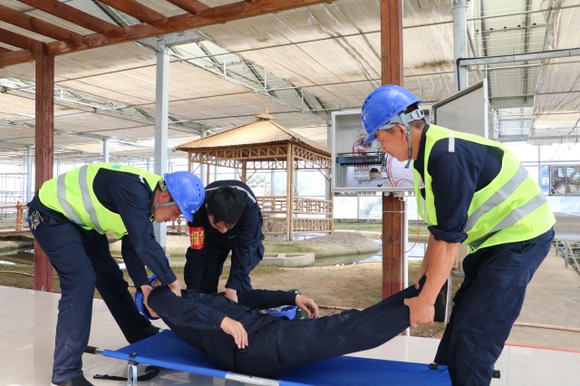 14時35分,刺耳的警報劃破寧靜,觸電搶救應急演練率先登場。四名電站運維員工組成的應急小組迅疾響應,嚴格按照預案流程行動。只見一人果斷切斷電源,另一人利用絕緣桿將“觸電者”安全脫離危險區(qū),其余隊員立即上前進行規(guī)范的心肺復蘇急救。整個過程緊張有序,展現(xiàn)了團隊在突發(fā)險情中的高效協(xié)作與過硬技能。演練結(jié)束,安全專家即時點評,對脫離電源的技術(shù)要點與心肺復蘇操作標準進行強化講解,切實提升現(xiàn)場人員的應急實戰(zhàn)能力。