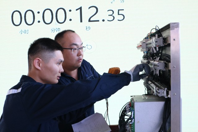 練兵場亦是競技臺。15時30分,高壓開關(guān)柜回路故障消缺實操比賽開始。多支參賽隊伍輪番上陣,在裁判嚴格監(jiān)督下展開較量。面對預設(shè)的復雜回路故障,選手們身著統(tǒng)一工裝,佩戴齊整防護,審閱圖紙、測試分析、精準排障。每一次舉手示意操作、每一次工具精準落點,都體現(xiàn)著“安全第一、規(guī)范先行”的鐵律。賽場氣氛緊張激烈,選手們沉著冷靜的故障診斷能力與嫻熟的動手能力贏得陣陣贊嘆。