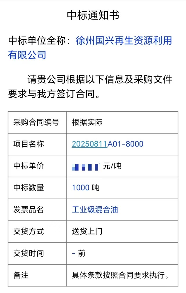 8月12日,徐州國(guó)興再生資源利用有限公司迎來重大突破——成功中標(biāo)連云港嘉澳新能源有限公司1000噸工業(yè)級(jí)混合油(UCO)采購(gòu)項(xiàng)目(中標(biāo)編號(hào):20250811A01-8000)。這是國(guó)興公司首次實(shí)現(xiàn)千噸級(jí)工業(yè)級(jí)混合油貿(mào)易,標(biāo)志著集團(tuán)公司在生物質(zhì)能源領(lǐng)域的市場(chǎng)開辟新道路,也為企業(yè)建立零碳工廠邁出堅(jiān)實(shí)的一步。