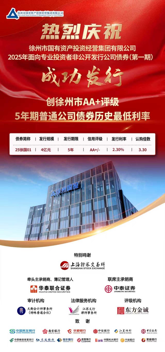 2025年10月31日,徐州國投集團成功發(fā)行面向?qū)I(yè)投資者非公開發(fā)行公司債券(第一期),發(fā)行利率2.30%,創(chuàng)下徐州市AA+評級5年期普通公司債券歷史最低發(fā)行利率紀(jì)錄。